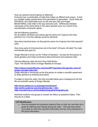 The chromosomes contain chemical substances called genes. Parents pass on genetic traits to their children. Genetics is simply the study of Heredity.